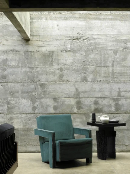 Fauteuil vert et table d’appoint dans un intérieur en béton