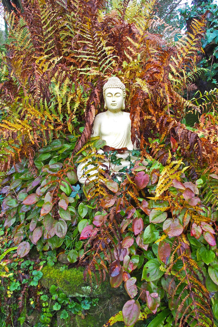 Statue de Bouddha au milieu de fougères et de feuillage coloré