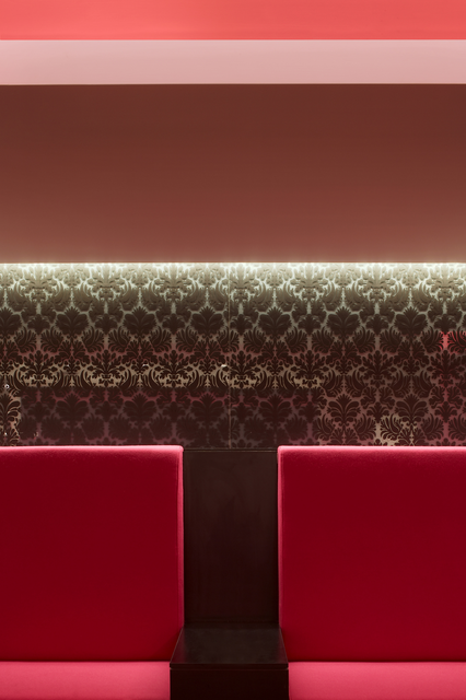 Bureau classique avec fenêtre vitrail et tapis rouge