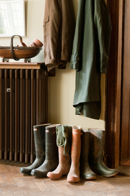Bottes de pluie et manteaux accrochés dans un hall d’entrée