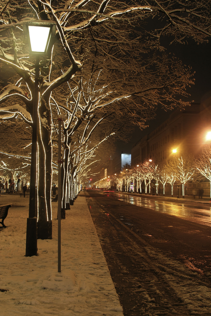 Avenue enneigée avec arbres illuminés en hiver nocturne