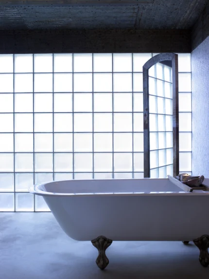 Baignoire sur pieds avec mur de briques de verre transparentes