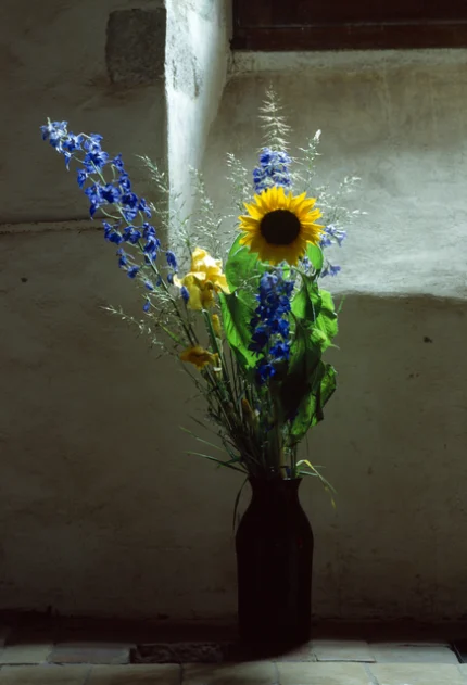 Bouquet de fleurs colorées dans un vase noir près d’une fenêtre en lumière douce