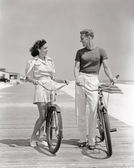Deux adultes en vélo sur une promenade à la plage