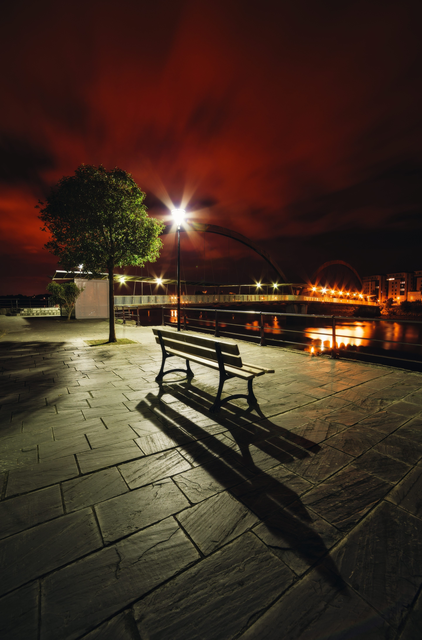 Banc sous un réverbère dans une ruelle pavée la nuit