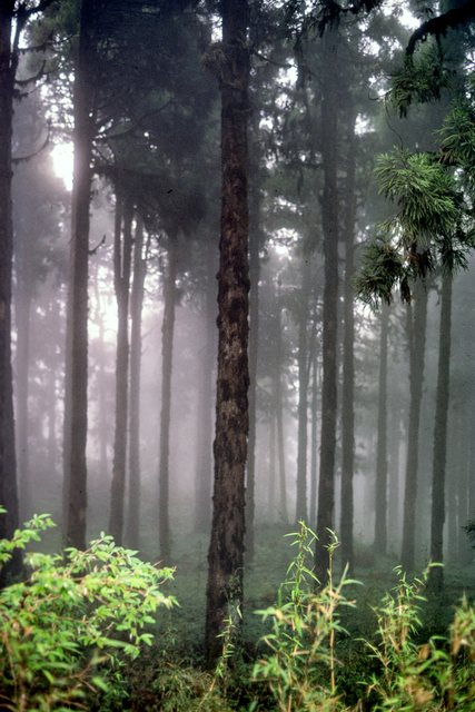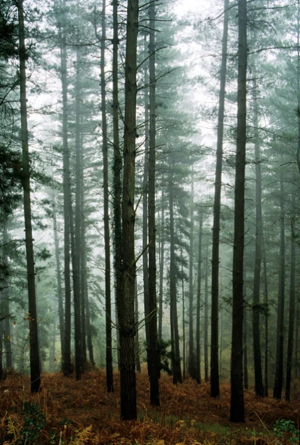 Forêt de conifères embrumée