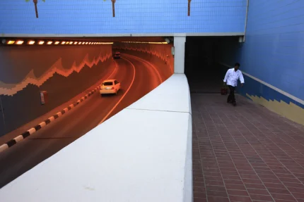 Tunnel routier coloré avec piéton sur le trottoir