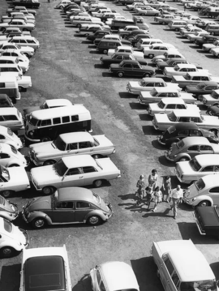 Parking rempli de voitures des années 1960 avec des gens marchant entre les véhicules