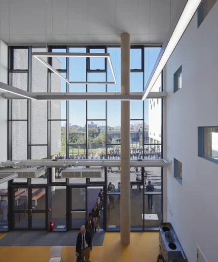 Intérieur moderne avec de grandes fenêtres et des personnes entrant