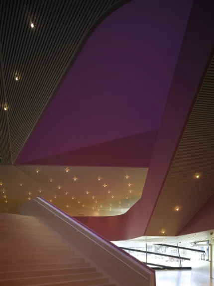 Escalier moderne sous un plafond géométrique illuminé