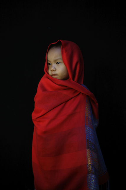 Enfant enroulé dans un châle rouge