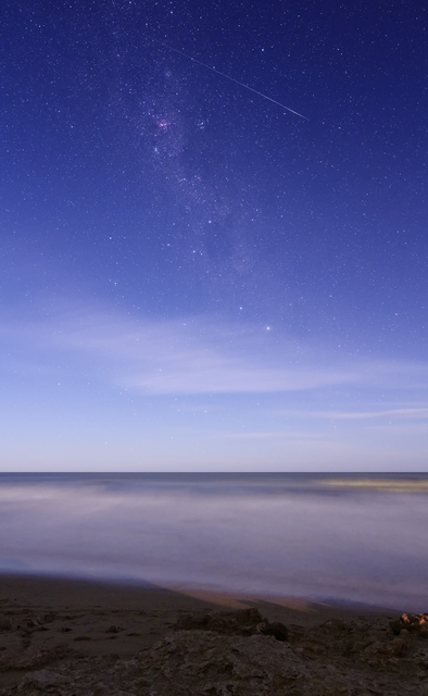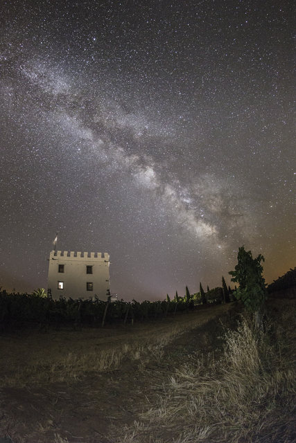 Ruine en pierres sous un ciel étoilé avec traînées de lumière