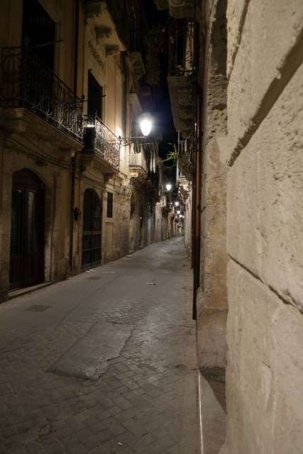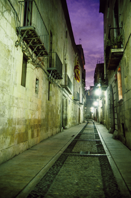 Porte en arcade d’une ruelle étroite avec une femme marchant au loin