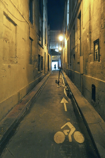 Ruelle étroite avec silhouette et trottinette électrique la nuit