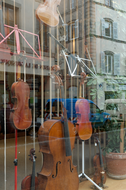 Instruments à cordes dans la vitrine d’un magasin de musique