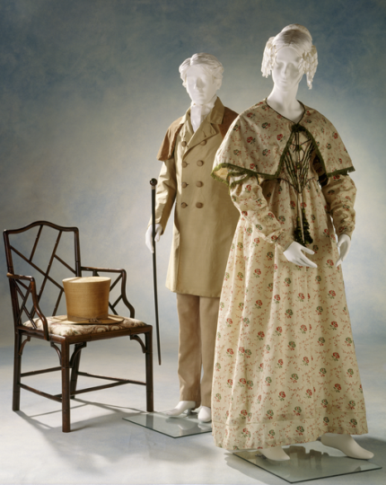 Mannequins en vêtements d’époque avec chaise en bois