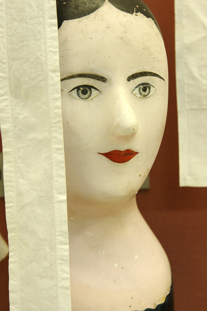 Tête de mannequin en céramique avec rideaux blancs