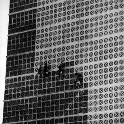 Travailleurs en hauteur nettoyant une façade d’immeuble