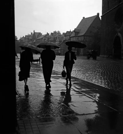 Promenade sous la pluie dans une rue pavée d’Europe.