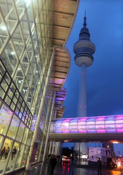 Tour de télécommunication moderne avec passerelle illuminée