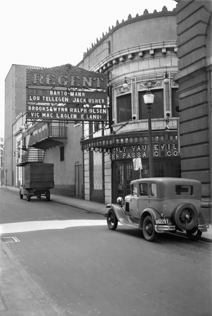 Façade d’un cinéma vintage avec voitures classiques dans la rue