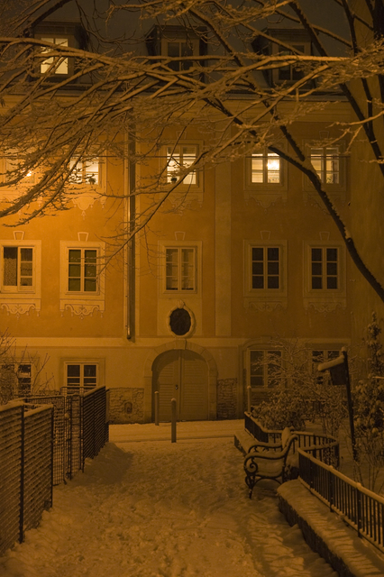 Façade d’un bâtiment européen sous la neige