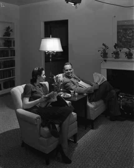 Salon moderne des années 70 avec bibliothèque, table et fauteuils