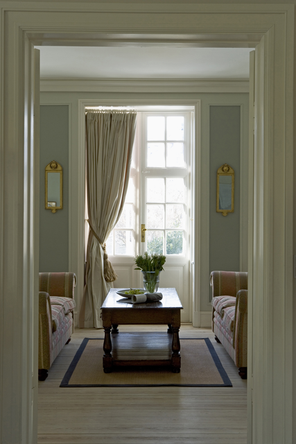 Salon élégant avec fenêtre encadrée et meubles classiques