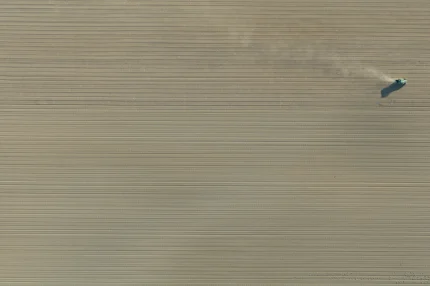 Tracteur labourant un champ depuis les airs
