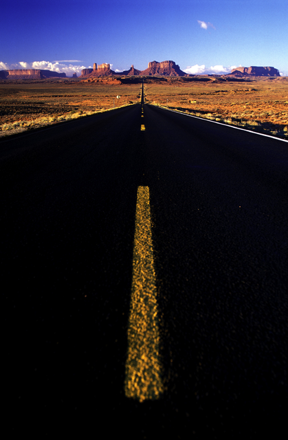 Route déserte menant à des formations rocheuses sous un ciel bleu