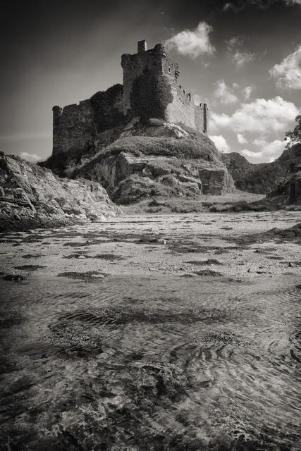 Ruines du château en plaine herbeuse sous un ciel nuageux