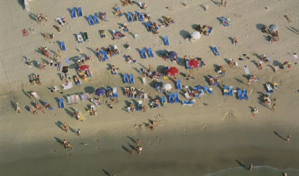 Vue aérienne d’une plage animée avec des parasols et des transats