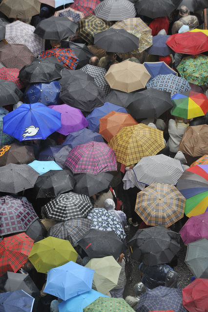 Vue aérienne de parapluies colorés lors d’une averse