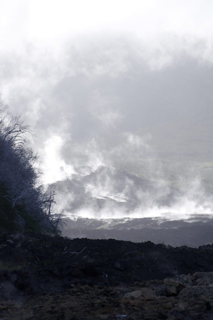 Champ de lave avec émissions de vapeur