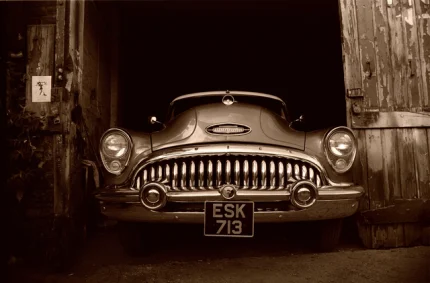 Voiture ancienne dans un garage en bois