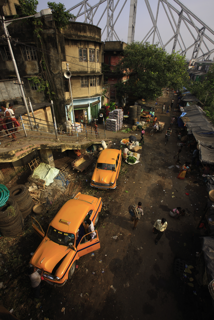 Rue animée d’une ville indienne avec taxis et habitants