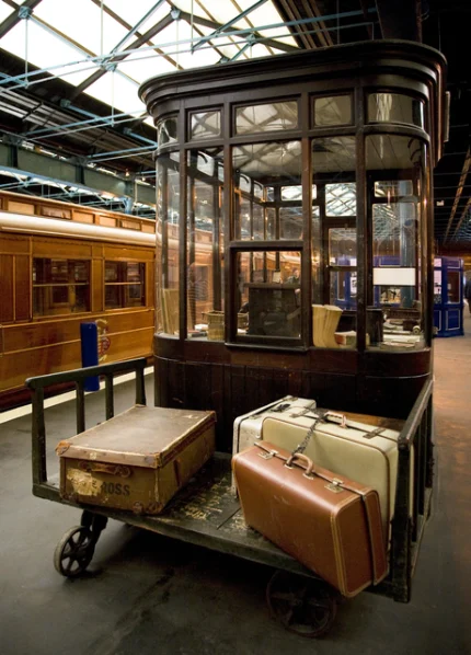 Ancienne locomotive à cabine bleue et crème en exposition