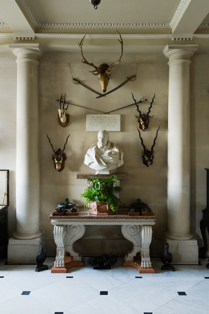 Buste en marbre avec trophées de chasse et colonnes classiques