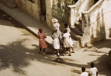 Scène de rue animée avec des femmes en conversation