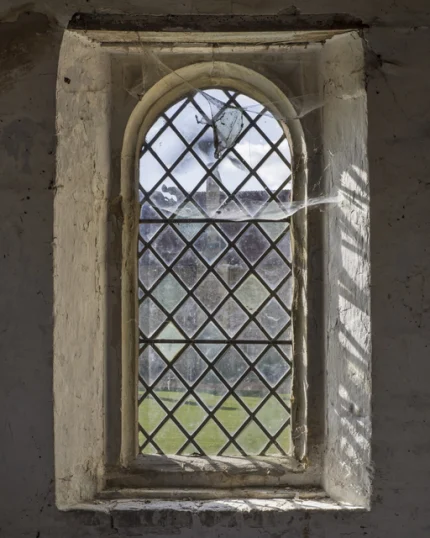 Fenêtre ancienne avec vitrail et toiles d’araignées