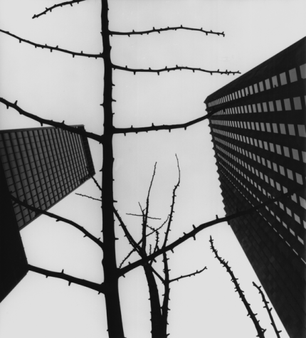 Arbre en hiver entre gratte-ciel