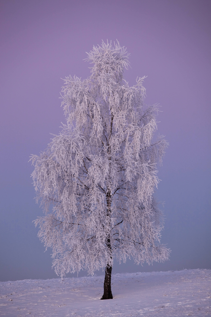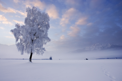 Arbre enneigé au lever du jour
