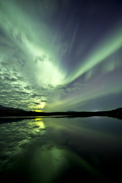 Aurore boréale lumineuse reflétée dans lac calme
