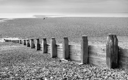 Barrière en bois sur une plage rocailleuse en noir et blanc