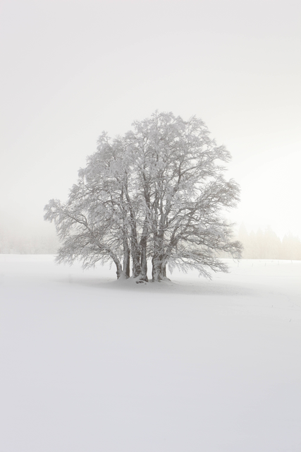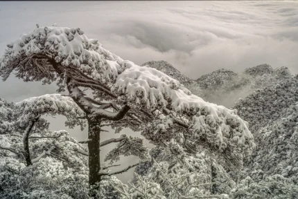 Arbre enneigé sur fond de montagnes brumeuses