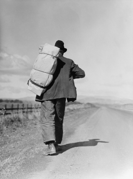 Homme marchant avec un grand sac à dos sur une route de campagne