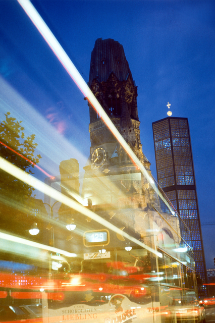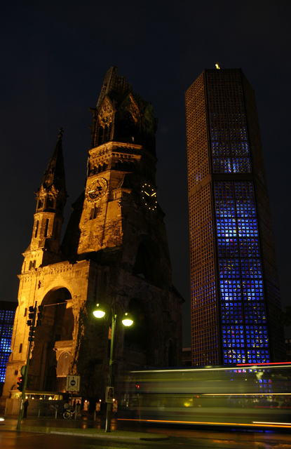 Église du Souvenir de Berlin la nuit avec des traînées lumineuses