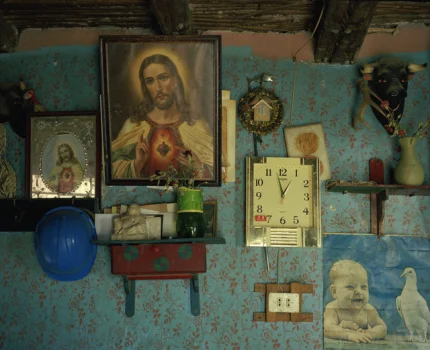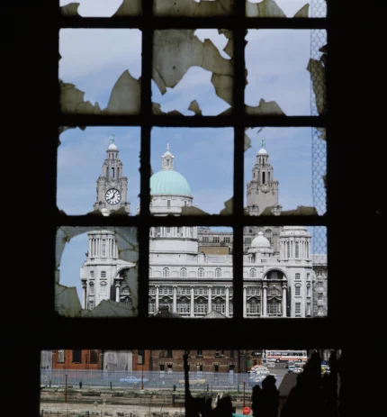 Vue à travers une fenêtre délabrée d’une structure historique.
