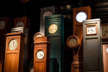 Collection de Grands Horloges dans une Salle Sombre