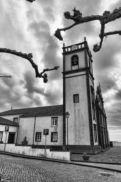 Clocher d’église sous un ciel nuageux en noir et blanc